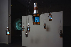 | Mississippi River Fugues, the most recent River Fugue, is a site-specific installation created for a solo exhibition at the Art Museum of the University of Memphis in 2008. Framing the main installation, the viewer walks through the entry space of the museum surrounded by voices of cotton farmers, river guides, levee supervisors and others telling their stories by the light of candles seen lit on the screens of portable dvd players embedded within hurricane lanterns suspended throughout the space. |