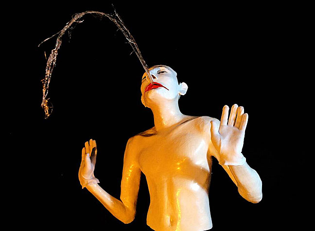 Another grouping of art figures is shown in A-MAN, a play on �Amen� and superheroes which features Robert Ryman, Cindy Sherman and Bruce Nauman. All of these artists play on and play up their respective identities but with exaggerated twists of pop and high cultures. Sherman, known for her role playing and gender bending, is shown here as a harlequin. She is watching Nauman, who is poised in his well know re-enactment of Marcel Duchamp�s Fountain with an added reference to the Joker, spitting on Ryman who is flying in the air like a super hero, canvas as shield. This tri-force of artists, giants in the field, are comical in their iconic poses which marks them as more then mortals.