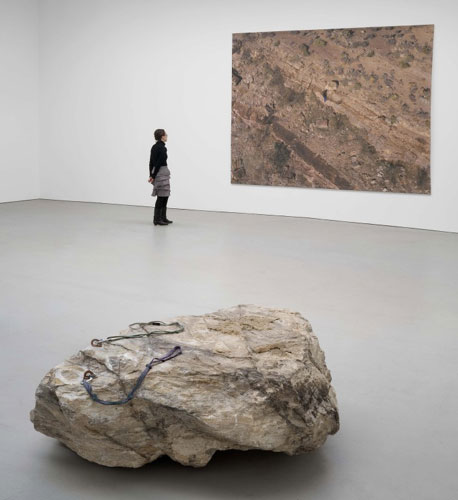 Jetex with solvent archival print, and rock, Rock: 28 x 69 x 54 in. Photo: 156 x 116.52 in Installation View, David Zwirner, 2009. Image © Adel Abdessemed, courtesy David Zwirner Gallery, NY