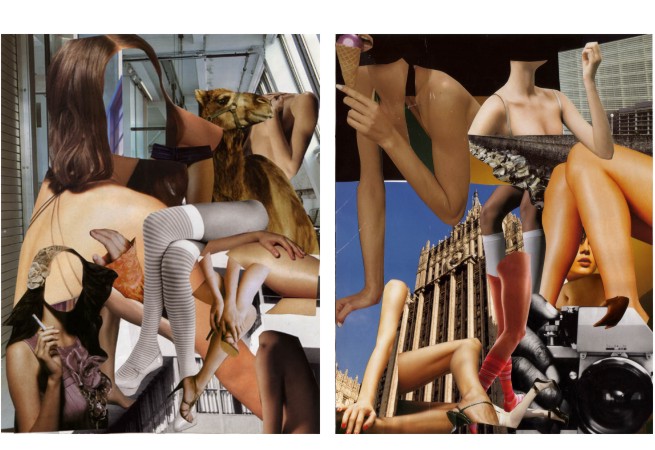 It is estimated we see 3,000 ads per day. Fashion and sex are two main selling points and are used nonstop to convince us to buy products we can do without. – The collages are abstractions, separating the projected image of the product from the material being sold. The concentration of images multiplies the potency while removing unnecessary images (ie. the products and identities of spokespeople).
