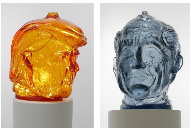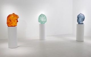 | Andy Yoder – Donald, Martha & Sam, Winkleman Gallery, New York, May 11 to June 9, 2007 Continuing his use of domestic objects, the focal point of the show is a group of three portrait busts, each in the form of an oversized glass piggybank.Over three years in the making and cast in brilliant colored lead crystal, they depict Donald Trump in a golden amber, Martha Stewart in pale green, and Wal-mart founder Sam Walton in gun-metal blue. | ||||