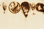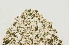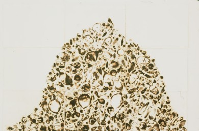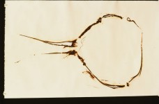 | The casual viewer may not instantly spot that these prints are made from glass, but no other material would be able to create these high-temperature, organic burns. They have a richness, translucency and liquidity that is an echo of the original glass form. The resulting burntimpressions have a high level of detail as the burns pass through layers of paper and also create embossed areas. They range in color from areas of rich, dense blacks to smoky sepias and watery yellows. The burns are full of light- they have a mysterious photographic quality; in some areas they look as if they are backlit. – – This recent body of work is based in ruins that I studied in 2002 in Italy. By using piles and stacks of traditional Roman glass forms, I once again connect these prints to their glass craft origins. The amphora-style forms I am using reference unearthed antiquities. That feeling of ancient, dirt-covered pieces speaks not only to the ideas of preciousness of the original object, but also extends the meaning of the print when it is completed: the final prints are brown, crusty, and damaged, like an excavated shard. These burn prints are poignant, because they exist simultaneously as aesthetic objects in their own right, and yet also speak of the object that was lost. | |||||||||