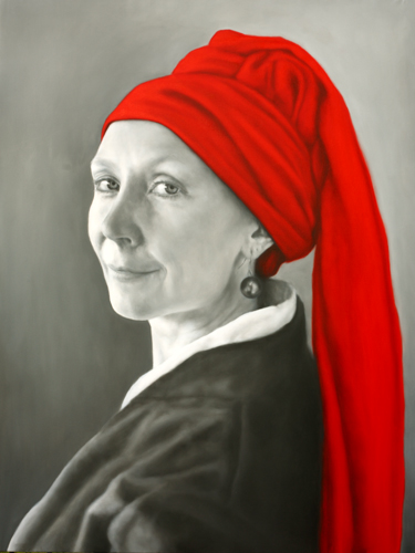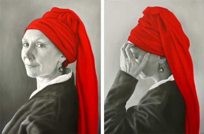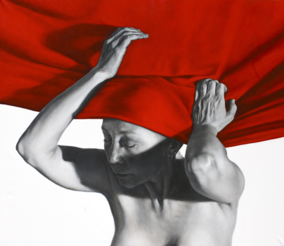 Recently within contemporary art there has been resurgence in using the portrait genre as a tool to explore concepts that reach beyond pure appearance and likeness. As an artist that uses portraiture, I am drawn to examine what it is that makes certain figurative artists compelling. ARINA’s faces stand out from the crowd with a graphic signature style that is memorable. The compositions have a bold directness with the monochromes and reds creating a visual language that communicates across cultures. Her use of light, composition and pose has a sense of a 17 Century Dutch artists like Vermeer but the use of scale, tone and reference to realism bring it firmly into the 21 Century. The qualities of her art have hints of her Russian background within the context of Western influences.