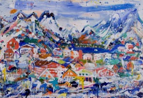 Images from top: Brendan Cass Der Storm, 2006 Acrylic on canvas 24 x 18” Brendan Cass Lofoten, 2006 Acrylic on canvas 78 x 108” Brendan Cass Germany, 2006 Acrylic on canvas 72 x 72” | Cass’ application of material conveys a tremendous sense of joy, and also an allegiance to chance and accident as a way to provide points for starting and stopping throughout construction of the piaintings. Heavy build-up of acrylic paint leaves a sculptural impasto on the picture plane inviting the shadow it casts to become a condition of the painting’s effect. The very physical process by which Cass works becomes an almost performative act; spills, smears and violent expulsions are all carefully choreographed to depict cliché European settings in a style that can be described as pop expressionism teetering on psychedelia. “You might deduce…that Cass is a Pop landscapist in the manner of Roy Lichtenstein. A look at the actual work will persuade you otherwise. These big canvases are energetically made with different kinds of brushwork, and indeed paint, and they pulse with a sense of real place. Whether that place is in Norway, say, or the artist’s own head, or both, is, of course, quite another thing.” – Anthony Haden-Guest.