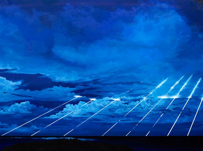 My paintings represent an ongoing examination of the connections and gaps between landscape painting and contemporary socio–political events. More specifically, I continue to focus on the manifestations of American expansion and its consequences on various environments. When viewed together, these paintings suggest a looming, pervasive military presence. However, I represent this presence indirectly to address, without celebrating, the violence caused by U.S. military action. With these allusive works I intend to blur the boundaries between civilian and militarized landscapes to provoke us all to ‘see’ this violence where we may not expect it. In doing so, I hope to re-sensitize myself and viewers to its grave consequences.