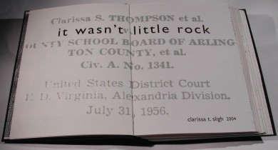| | | It Wasn't Little Rock is a narrative that explores the life of Mozelle, a passive American Southern black woman, who feeds her children one by one into the country’s 1950s school racial integration “experiment” and their later reflections on that situation. The book was created to commemorate the 50th anniversary of the Supreme Court's Brown vs. Board of Education decision which ruled that “separate but equal” schools were unconstitutional. The title, It Wasn't Little Rock, comes from the response given by black students, when describing their experiences at the newly integrated schools. | |