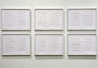| Detail of “On Computable Numbers” Paper Framed dimensions 10.4” x 14.2” 2006 All of the text removed except for the 1s and 0s from Alan Turing’s 33 page essay “On Computable Numbers.” |