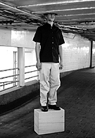 << The image to the left is from the Commutes: MTA series. It is documentation of a performance enacted in the 42nd Street/Times Square subway station. I constructed a special attaché to carry on my daily commute. It's dimentions are based on the difference betwen my body and a peculiar hole in the ceiling. When I reach the site, I place the ataché beneath the hole and step up, inserting my body betwen the ataché and the ceiling, with my head in the depth of the hole. I pause here for a few moments, allowing this landmark a place on my personal itinerary, then I move on. . .