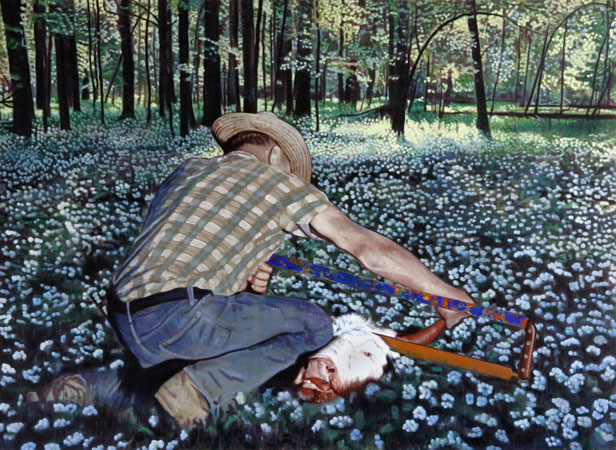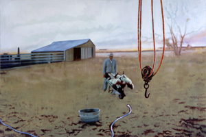 In the paintings High lonesome and Land grab, we witness male figures dressed as cowboys at work, performing the manual labour of constructing shelters and fences. This use of the metaphor of building, of course, speaks of simplistic frontier civilisations and the dividing of land, but further to this, it cleverly runs parallel to Rook�s own construction of space as a painter, through his assemblage of source imagery and the multiple layers of paint application. Rook acknowledges the common ground between the heroic iconography of the early settlers, defining their own identities, and the myth of the artist, searching for answers. This is further reinforced through Rook�s choice of raw brown linen to paint on, where he is playing with the embryonic relationship of the �ground� of his painting, and the raw dry landscape of the imagery. Thus, it�s perhaps not stretching the imagination to see the figure in High lonesome as Rook, the painter, making his presence and position felt within the terrain of contemporary painting.