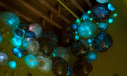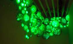 | Terrarium is an installation intended to provide lighting to the lobby of a landmark building. From dusk to dawn, shifting patterns of light radiate from an assortment of acrylic bubbles mounted on the walls. The work is an organic space within the city and a simultaneous extension of the urban surroundings. The spherical shapes and colors evoke an almost amphibian quality, yet displayed within these bubbles are photographs showing us the past and present life of this building. The piece represents a middle ground between the private and public, a compromise between the tranquility of the indoors and the din of the hectic city. This work of art is meant to inspire reflection. The contradictions embodied therein evoke a feeling of elements taken out of context, rearranged, and reconstructed to form something entirely new. To passers-by on the street, it is an alteration of a familiar landscape, a moment to re-imagine their daily world. | |||||||||