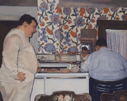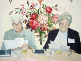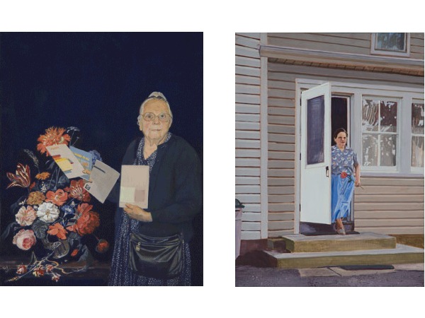 Images from top: Untitled 2 (Martha) 2007 Mrs. Horst I 2006 Two Sisters 2007 Merv & Mr. Horst 2007 | The care with which Ms. Holsinger paints imparts a spare and documentary directness that at the same time uncannily imbues her subjects with emotional resonance. Incidental details of distortion from wide angles and flash effects are evident in most of the paintings, making it clear that her sitters, frequently taken out of the context of time, are contemporary. Moreover, the perfection of detail manifested in the works comes across as almost emblematic of the people themselves in their orderly and austere environments and in their straightforward natures. Furthermore, Ms. Holsinger mines art history to import recognizable visual references into some of the portraits. For example, a Van Gogh sunflower vase appears on the kitchen table behind a woman washing dishes at her sink in Mrs. Horst II, and a Dutch Flemish baroque floral arrangement can be seen in Martha II. The artist was encouraged to include such references upon learning that the 17th Century Dutch Mennonites sat for paintings by Rembrandt, patronized the arts, and became painters themselves.