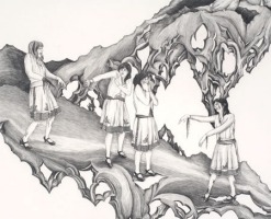 The compositional elements of the drawings reflect Vala's concern with a contemporary revisiting of ancient forms. Just as Isis' veil winds and twists, Vala's compositions trail down the paper, with perspective, scale and shadow losing their logical solidity. With a nod to Chinese scrolls, each piece posits a linear representation of the subject's life path through a successive series of struggles. Vala uses the Tibetan vajra-rock islands or cliffs (inverted pyramids upon which wrathful deities rest) as the stage for the girls' confrontations with their demons. Moreover, the intensity and gravity of the narrative are punctuated by the total absence of color throughout the exhibition.
