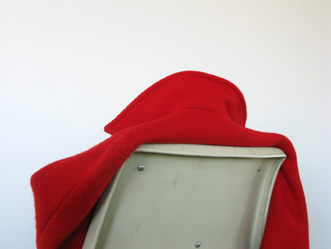 The various jackets that rest half-slack, half-erect in a plain chair in a stripped studio in the series Jacket take on acute human nuance despite being emptied of a body. Often seen from behind the chair`s back (the top rim of the back of the chair makes for a kind of horizon line), the articles can only be observed through the attitude of a collar, the implications of fragmented fabric, and the notion of occasional clothing. A gray knitted sweater slumps, hangs and withdraws at the waist, its open neck loose and widened by wear. A red fleece pull-over with a stiff collar seems resolute and attentive, the bold color and angled neck-line suggesting a firm directional gaze. A fur coat sit in soft, dark-hued piles — a frayed tear in its next exposes raw leather skin suggesting something both opulent and basely animal.