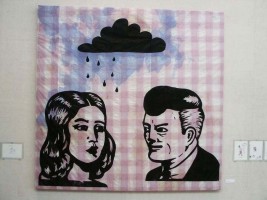 | IMAGE DESCRIPTION : from top of page to bottom – “Self portrait with dog” 2007. Acrylic paint/oil and wood cut on fabric 137x220cm – – Smoker.2004. 180 x 200cm. Watercolour and woodcut on Japanese paper mounted on a 2 x 4 cm wooden frame. – – – Picknick. 2004. 200 x 220cm. Watercolour and woodcut on Japanese paper mounted on a 2 x 4 cm wooden frame. | ||||