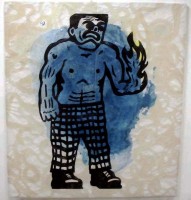 EDUCATION – Konstnarlig grundutb. Falun 1988. – The Art Students League of N.Y 1990-91. – Academy of Fine Arts (MFA) 1991-96. – Dramatiska institutet – University College of Film, Stockholm. Spring 1995. – Fine Arts & New Media. Goteborg.univ.1998-99. – – – RECENT SELECTED SHOWS – The 7th Biennal Of graphic art of the baltic states Kaliningrad – 2002. – Liljevalchs konsthall. varsalongen. Stockholm. – 2004. – Dalarnas Museum konsthallen. ‘Storytelling’ with Jonas Kjellgren.2004. Falun. – Studion 44 ‘storytelling part 2’ with Jonas Kjellgren.- 2005 Sthlm.Night of 1,000 Drawings. Artistspace N.Y.c. 2006 | I´m working with large prints usually 2 x 2 meters. I always apply watercolour on a sheet of Japanese paper before I decide what kind of woodblock I will be using to complete the artwork. Before I start to make these huge prints I make approximately a hundred sketches to decide the form of the woodblock, a man, a big hand, an arrow, a girl, an openfire or an animal. If I just want to make a simple symbol I do so, the clichés will be put together later on as a puzzle and than make some kind of sense to me. The idea of making over two meter prints was simply that I wanted to see my small drawings in a bigger form (the way a film maker that makes small 36mm film into a widescreen movie experience). I’m using traditional working tools on MDF-board (similar to plywood) and a jigsaw to cut out the charcoal drawing, which I make on the board.