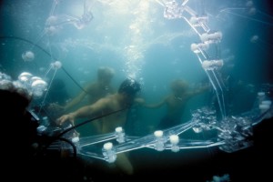 The installation "Memorial Project Minamata: Neither Either nor Neither - A Love Story" is comprised of scenes both in and out of the water, each a key component in this complex piece. Clips of orange smoke disrupt a shot of children playing and then a haunting "dance" takes place in an underwater dream world suspended within an unwieldy and collapsible sphere. A young woman lies in a small room outside of mosquito netting and next a dizzying scene of a dance club with loud Techno music appears inter cut with animated shots from underwater. This was the artist's most difficult film shoot to date because cooperation between the divers was crucial in creating the slow continuous motion.