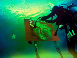 "Ho! Ho! Ho! Merry Christmas: Battle of Easel Point - Memorial Project Okinawa" references an American military base with strategic access to Southeast Asia. In this film, divers go underwater carrying easels and armed with paint to participate in a painting "battle." Commenting on the representation and interpretation of war, the divers in this film struggle to create portraits of Hollywood actors who starred in glamorized films about the Vietnam War, but there are no winners and the futile mission cannot be completed.