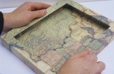 The playful Big River takes the form of a child’s pocket game. The viewer maneuvers the box to position each of the balls into a divot corresponding to a city mentioned in the Johnny Cash song, Big River, where the lovesick narrator chases his woman down the Mississippi River, missing her at every port.