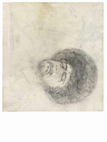 | left: Underhill [Casco Bay; ME] V/V – cutout rotten tennisball 2003 2'' x 2'' x 2'' 5x5x5cm bottom middle: deathbed drawing [Bob Ross] – pencil, eraser, cleaning detergent 2003 6 1/2'' x 6 7/8'' 16.5×17.5cm |