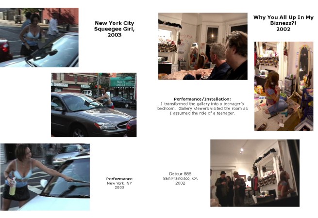 Above image - Limited Situation, 2000 - Performance - I became a prostitute for one night. 4 Walls Gallery, San Francisco, 2000. - Below image - Camel Toe, 2000 - Performance - Trying to put on a very small pair jeans. | In all my works, there is an underlying theme of endurance. I was once a competitive swimmer. The mindset of the athlete, pushing the body and mind to extreme physical and mental limits, has been a major influence on my process of art making and my approach to life in general. I see every phase of my life and Art as transitional as well as influential. My existence as a human being is an experience that will build, grow and resonate.
