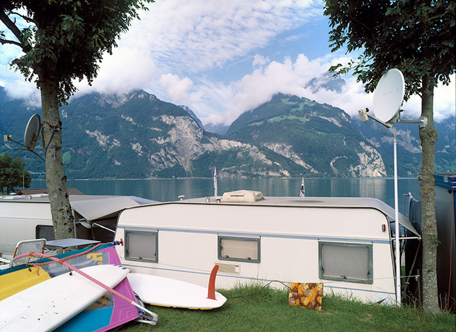 "We begin with the provisional assumption that wheeled travelers fall quite neatly into two mutually exclusive categories: Roadtrippers and Campers. Roadtrippers experience their sojourns virtually through the mediating frame of the windshield, safe within a metaphoric (and largely illusory) bubble of interiority. They are akin to the subjects of cinema. Campers yearn for the nitty gritty details of contact. They position themselves on the front lines, negotiating locality and globality. Camping for the photographers Klaus Knoll and Cella constitutes what Gilles Deleuze might have called a �happy deterritorialization.� Claire Daigle, San Francisco Art Institute
