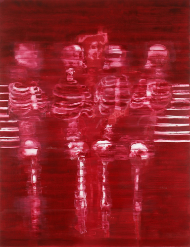 In its approach the work at times draws inspiration and relates closely to the language of contemporary writers, playwrights, and poets, particularly to the work of Samuel Beckett. Like many of Beckett�s characters, the figures in my work - are often constricted by their emotional and physical situations, memories, thoughts, and space. They are often only looking, sitting, or feeling, bound to the functions and control of their inner mechanisms and being, or outer experiences. Stylistically, images of the self in situations of interaction, solitude, and experiencing the dimension of time are often blurred, showing the ambiguous uncertainty and instability of reality. At times, there is a seemingly deliberate obsession with certain colors, images and faces, particular objects, and inner anatomical organs that constantly reappear, further accentuating the dimension of time and a more complex space and language