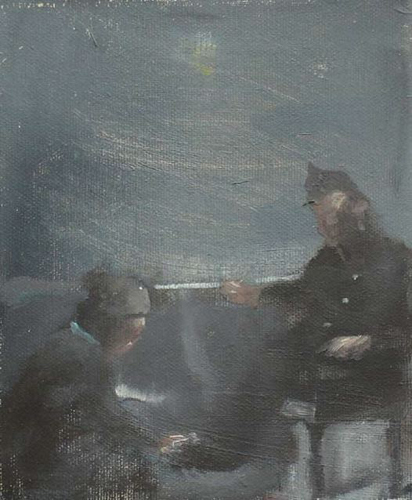 Far from banishing us to the role of outsider or voyeur, Bercea’s uniquely personal and nostalgic approach elicits empathy and a sense of longing for our own pasts. The prompt for us to begin searching our own memories might be a sensitively described scene, an exchange between figures or a spontaneous gesture (it differs from painting to painting), but the consistent factor is that each depicted subject possesses a particular significance for Bercea – a trace to an actual experience – and it is the grounding of each work in an historical event that both lends weight and helps us to forge a connection.