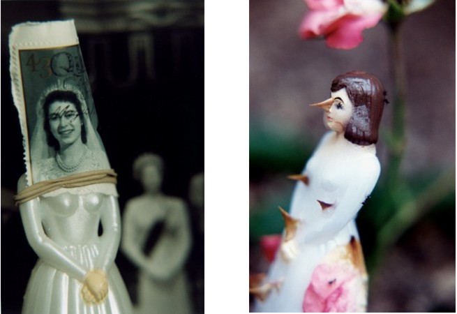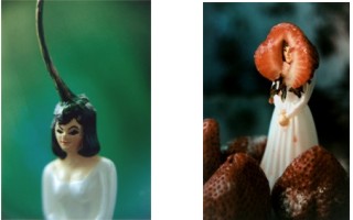 Series title: Anti-Selfing – The Beauty In The Age of Advanced Mechanical Reproduction (c) 2004-5 These “female-ish” portraits, which are made of vegetables and fruits, are taken under my search for where the “beauty aura” comes from in the age of advanced mechanical reproduction. Nowadays, there are so many ways to expect miracles on your surfaces, and people are spending so much money for the anti-aging solution. Living in this circumstance, it seems as if we are no longer allowed to age naturally, nor remain as a unique organic form. I wonder how we can appreciate the beauty of these organic ladies? Right Image: Nikita (Kiwi Fruit) C-print, 14″x20″ | Interchangeable Disturbance (ID) consists of 50 color photographs centered on desires and fantasies of a wedding cake figurine. Her magical transforming energy seems to come from her dissatisfaction with her identity as a determined object. This murky scenario suggests phenomena which shifting surface identity produces an ambivalent presence. While she is simulating magical effects on her surface, she is gradually trapped between reality and ideality. As a result, a mixture of pleasure and disturbance comes to her at the same time. Her never-ending exploration into her identity adds more and more personas to her surface, yet, ironically, her new personas persistently keep her on the wedding cake. Lynda (Kiwi Fruit) C-print