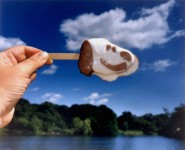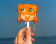 I chose a selection of ice pops on a stick in the shape of pop cultural icons, i.e. bugs bunny, pokemon, and tweety, from the Mr. Softee truck that drove by my house daily. I posed these figures against the surrounding landscape. They slowly melt under the sun and lose their candy features and distinctive outline. Tension is created between attraction and repulsion as this sweet summer treat distorts and becomes grotesque as it melts. The ice cream is as ephemeral as a perfect summer day.