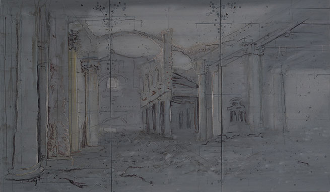 Like old vinyl records, the surfaces of Raedecker�s canvases are scratched, their contents muffled and subdued. Deliberately infested with the hairs of fabrics and striated with scars, his paintings give off the allure and romance of age. Their subjects are often places in decline: un-peopled landscapes, ancient ruins, pallid villains from history and modernist bungalows. Raedecker depicts the classic genres of painting � landscape, portraiture and still life � as neglected and gone to seed in works that treat their heritage with both nostalgia and suspicion. Ambiguities and tensions are rife within his works, compounded by titles that jar creepily with what they represent � for instance calling such innocuous motifs as still lifes and decorative garlands of flowers �pornography� and �paranonia�. Through the artist�s signature combination of thread and paint, two-dimensional imagery is pitted against three-dimensional objecthood, simultaneously demanding that the viewer believes in the illusory spaces they depict whilst acknowledging their fabrication. In some of Raedecker�s works paint drips have been carefully sewn onto the canvas, skilfully replicating marks caused by fluidity and chance; in others the artist has pushed acrylic pigment through the rough mesh of embroiderers� linen so it forms thread-like squiggles of paint. Self-reflexivity is intrinsic to all of Raedecker�s works, enabling his successful combination of arch humour with skill, and bathos with a serious investigation into the contemporary state of painting.