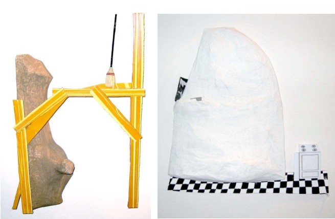 I am inspired by the physicality of objects and their surroundings. I use my memory of them to create compositions that are the result of some form of contemplated action. Many of my works contain imagery of stones, wedges, and wooden planks. Sometimes those materials are used within a drawing or sculpture to make buildings, fences, or parts of walls; other times they are used formally to tilt a basket or hold up a leaning handbag. | My work combines formalism, narrative, man-made structures and nature. The arrangement of various objects and building materials are the aftermath of basic building techniques such as stacking, layering, and joining. Papier-m�ch� is my primary sculpture material. Using the same material throughout, the sculptures refer more to themselves than to the actual material itself- much in the way that drawing does.