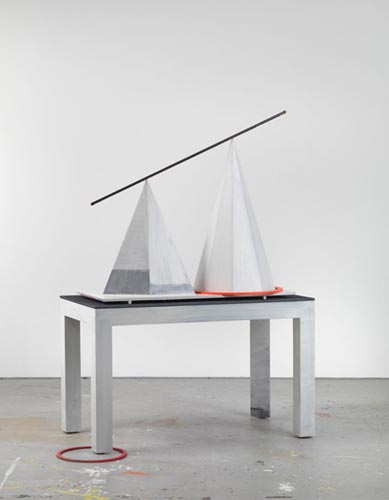 Scheibitz�s non-heirarchical approach to dimensionality is indicative of his interest in exploring how space is understood. In past bodies of work cartographic plans, diagrams and methods of representing landscapes have been of great importance. The title of the current exhibition, Missing Link in Delphi, continues this investigation by referencing Delphi, a city that in Greek mythology was seen as the seat of the world and the center of the universe. Referencing a specific geographic location, particularly one of such classical importance, orients the viewer to the work, which becomes a kind of landscape in itself, with paintings as vistas and sculpture as topography. The combination of this reference to Delphi, with the term 'missing link,' which refers to Darwin�s theory of evolution and the 'transitional forms' of life between one evolutionary phase and the next, explores and combines dueling spiritual and scientific perspectives. The title of the show, and of each piece, adds a linguistic layer to Scheibitz�s formal and compositional puzzle.