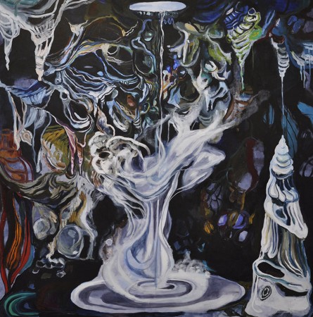Stalagmite and stalagtite appear in expressive colours, and the space in The Cave dissolves. In the middle of the painting water is simultaneously dropping down from the top to the bottom and ascent spectral. The unseizable upward movement gives the painting a dynamic, unreal and dreamy effect. The artist achieves this effect not only through a watery way the colour is applied but also through her detailed way of painting. Undercurrents for example is her first piece where she combines ink and oil paint on the canvas at the same time. Her virtuosic brush handling and many years of experience with oil paint and solvent gives her the skill to create a remarkable atmosphere in her paintings.