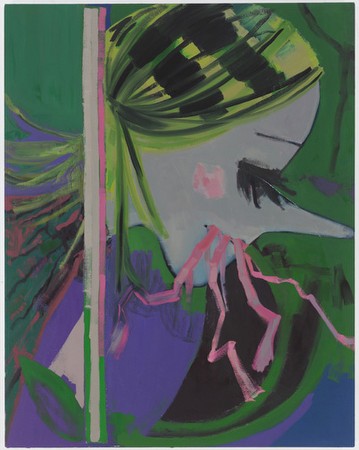 | Ellen Berkenblit March 1 - March 31, 2012 Opening reception: Thursday, March 1 from 6:00 - 8:00 pm In her fifth solo show at Anton Kern Gallery, New York-based painter Ellen Berkenblit presents a new body of intensely colored, energetic, figurative paintings. Layers of rawness and vulnerability are uncovered from densely built-up images of light, figure and a tangible sense of atmosphere and emotional depth. Berkenblit applies a distinctive palette of vigorously mixed colors with assertive broad brushstrokes and some scraping of the palette knife. Her shapes are rough yet well-defined fields of color; occasional black outlines can define an object, an animal, or the features of a face. Out of the paintings’ visceral physicality emerge certain themes, motifs and ideas: a head in profile featuring intense black lashes and long shimmering hair, lacey ribbons (painted as angular and deliciously awkward bands of paint that vigorously pull together the paintings’ fore- and middle-grounds). Even purely atmospheric sensations such as clouds, bolts of sun light, rainbows and starry night skies find expression. These images simultaneously emerge out of the subjects’ relevance and the visibly exuberant act of painting. The paintings’ spirit is bold, boisterous and forceful, sometimes mysterious, always deeply emotional. The interplay between figurative elements, the intense atmosphere created by color contrast and tonal palette, as well as the compositional devices create figurative paintings of great fluidity and openness without being narrowed by narrative. | ||||