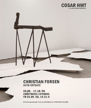 | CHRISTIAN FORSEN AUTO-ENTSATZ 05.09. - 17.10.2008 EROFNUNG / OPENING FR 05.09.2008, 19-21 H Ab 22 Uhr gemeinsame Party mit ARTLEIB in der PETRA RINCK GALERIE | ||||