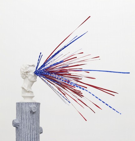 | Brian Tolle: Commander in Chief October 11 - November 10, 2011 Opening Reception: October 11, 6-8PM Abraham Lincoln gave two inaugural addresses: the first was given just before the American Civil War; the second was given days before it ended. Three months after the second speech, Lincoln was assassinated by John Wilkes Booth, who was incensed by Lincoln's public support of voting rights for African-Americans. The pressure of the bullet shot at close range into Lincoln's head was so powerful that his eyes violently projected out of his sockets. In Brian Tolle's second show at CRG Gallery, he uses a porcelain white bust of the sixteenth president which rests on a faux-granite log. The words of Lincoln's two inaugural orations are written on red, white and blue silk ribbons and explode outwards from the bust's eyes. Tolle fuses Lincoln's presidential prose with a grim biological fact to highlight the aspects of his presidency that he is most remembered for: his penchant for moving language (and its subsequent effect on abolishing slavery) and his assassination. This gesture is a play on our historical memory and points to the fact that what is relevant about each president can be distilled, over time, to just a few singular events or attributes. Each work in Tolle's show focuses on one president and is numerically titled according to his place in the line of presidents: George Washington is “No. 1” (2012), Barack Obama is “No. 44” (2012). The sculptures usually feature the head of the president, cast from an appropriated presidential bust. In employing these heads, Tolle highlights the importance of each man's thinking and political doctrine, and how these legacies are the continued responsibility of their successors. Each also includes ephemera associated with that particular presidency: Ronald Reagan's clear acrylic head is filled with the Jelly Belly candies which could always be found on his desk, John F. Kennedy's gleaming silver head is supported by Sputnik-like legs as a nod to his "space race" with the Soviet Union, Eisenhower's bust is split in half and supports a first edition compilation of his speeches and writings, which notably include his "Bookend Speeches." A number of the sculptural components are culled from the internet and are vestiges of Americana craft practices, many of which have now been discontinued. Barack Obama's “coif” is comprised of a collector's set of all of the presidential figures preceding him, which was purchased by the artist on eBay. The jewel tone ornaments adorning “Spirit of ‘76” (2012), a rotating aluminum Christmas tree, are miniature whiskey bottles, each with a molded portrait of Presidents Washington through Nixon. How these cultural relics are integrated into popular memory and, in turn, our consumer market, is central to the artist's interest. One of only two pieces in the show that is not focused on a single president is “Winners and Losers” (2012). It is a diptych on two circular canvases, each covered in the Democratic, Republican, and third party candidates' presidential campaign buttons since the patenting of the pin-back button in 1893. The “Winners” canvas is comprised of fourteen pins in total, the “Losers” brandishes hundreds. As much as this disparity calls attention to the many voices and agendas that have been unrecognized in America's democratic process, it equally emphasizes marketing trends and the extent to which politicians fabricate a public persona and how they appeal so explicitly to subsets of the American population. Through Tolle's historical eye, we are asked to question how we recall our national history, and more importantly how popular culture and political rhetoric inform and simplify our opinions.Brian Tolle received his BA in Political Science from SUNY at Albany, NY, a BFA from Parsons the New School for Design, New York, NY, and an MFA from Yale University, New Haven, CT. Tolle has major public works in the United States and Europe, including "Irish Hunger Memorial" in Battery Park City, New York, NY, and "Simnai Dirdro (Twisted Chimney)" in Caerphilly, Wales, UK. He is currently working on several important public projects in Brooklyn, NY, Columbus, OH, Houston, TX and Calgary, Alberta, Canada. The artist lives and works in New York. | ||||