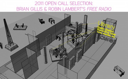 | Brian Gillis & Robin Lambert's FREE RADIO 2011 Open Call Selection With Free Radio, Lambert and Gillis proposed to build a functioning radio station inside the gallery with related educational materials and programming. The station will be built over the course of five days, used for a one-hour test broadcast when completed, and disassembled each week. The exhibition, and its related programming, will be on view at CUE from March 24 to May 5, 2012. PROJECT DESCRIPTION: Free Radio is a community-based project that uses CUE Art Foundation's gallery from March 24 - May 5, 2012 as a laboratory in which a different local community will be aided each week with the construction of an on-site radio station and the development of radio programming relative to that community. Each one-week session will be comprised of a series of activities directed toward community building, the development of a voice, archiving that voice, and providing the skills associated with radio technology that will culminate in a public broadcast produced entirely by that community and transmitted to the greater New York City metropolitan area. This process will be perpetually archived and transmitted via the internet as well, so as to simultaneously preserve and broadcast the process beyond the walls of the gallery and the range of the radio broadcast. The ultimate goal of this project is to publicly seed community development and training relative to radio broadcasting so as to make the notion of organizing a community to broadcast its voice something that is both more valuable and accessible to the public at large. Free Radio was conceived of by artists, is sited at CUE Art Foundation, and is driven by the reconsideration of the gallery as a cultural hub. The gallery will serve as a place that uses art to catalyze discourse and the dissemination of information, and as a site for tool building while mining and solidifying the identity of a community. Free Radio was born out of a belief that every community has a voice that could be a relevant part of a larger society, and an investment in the development and proliferation of that voice will make its community richer and in doing so will contribute exponentially to a population outside of its own. This project is made possible by an international organization of people ranging from artists and computer hackers to scientists and educators who are in place to work with specific local communities to facilitate community individuation, the development of a voice, and the weekly construction of a functioning radio station and culminating broadcast for the dissemination of that voice. Free Radio hybridizes the idea of a sourdough starter and the notion that teaching someone to fish is more valuable and resonant that merely giving someone a fish. Free Radio is as much about being a witness as it is about being a participant. As such, a primary concern is the incubation and perpetual broadcast of this process of community individuation and the mass dissemination of a voice, whether live or as an archived loop on the internet. It is about the mass distribution of open source information, which focuses on the democratization of a technology that is free to access, relatively ungovernable, easy to build, and so important to a free society -- RADIO. FREE RADIO IS: Brian Gillis, Eugene, Oregon gillislab.com Robin Lambert, Alberta, Canada robinlambert.ca Elizabeth Dunn-Ruiz, New York, New York verbalpyrotechnics.com John Park, Eugene, Oregon johnparkonline.com Ryan Paxton, Brooklyn, New York Mark DeBernadis, Brooklyn, New York saintjamesproductions.com | ||||