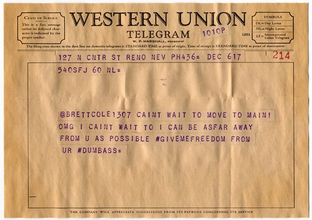 Charles Gute, @brettcole1307 from the series Random Tweets Reformatted as Telegrams Letterpress and mixed media on vintage paper. 2102 5 5/8 x 8 inches | |||