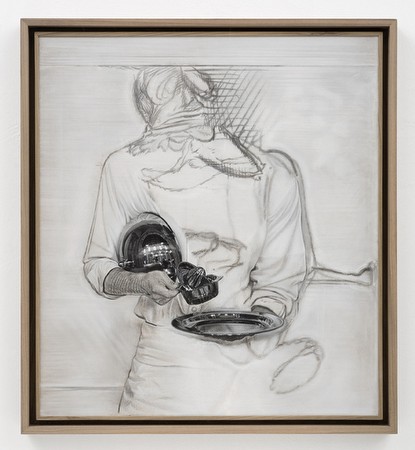 | Pietro Roccasalva The Strange Young Neighbours February 11 – March 24, 2012 Opening reception: Saturday, February 11, 2012, 6:00–9:00pm David Kordansky Gallery is very pleased to announce The Strange Young Neighbours, a solo exhibition by Pietro Roccasalva. The show is Roccasalva's first with the gallery, as well as his first solo gallery exhibition in the United States. It will include paintings, drawings, a neon work, and a large-scale sculptural installation that will serve as the site for a tableau vivant performance. The performance will take place on Saturday, February 11th, beginning at 11:00am and continuing until the end of the opening reception at 9:00pm. Roccasalva explores the potential for art objects to become active agents of simulacrum, sites where the animate and inanimate worlds undergo profound crossing. Painting serves as the orbital center for a practice that includes sculpture, performance, and video, and that has increasingly come to represent a self-contained universe of poetic narratives and philosophical inquiries. Roccasalva has referred to his paintings as 'microchips', devices that organize an ever-expanding network of processes and allusions. Synthesizing compositional strategies drawn from religious iconography, modernist collage, and digital distortion, and skillfully rendered over months and even years, the figures in the paintings are both deeply familiar and impossibly strange. They freeze the gaze and conjure the sense that though artworks can never be fully understood, they are caught with their viewers in an endless feedback loop of exchanged signification. The Strange Young Neighbours borrows its title from a standalone tale in Goethe's 1809 novel Elective Affinities. In the story, a near-catastrophic drowning plays a key role in uniting a young couple destined to be together since childhood. Though the onset of adulthood and its misunderstood passions temporarily drive them apart, when the girl jumps from a moving boat and the boy saves her, they finally realize that they are in fact meant to be married. This tale is just one of the texts that inform Just Married Machine, a major sculptural installation that occupies the center of the gallery and sets the stage for a series of new paintings as well as the tableau vivant. A wooden boat suggests direct connection to Goethe's narrative, but the other objects suggest that additional processes are at play. In fact, the scene is also based on a still/still life taken from the short Pasolini film La Ricotta. Roccasalva has allowed a series of visual slippages to transform objects depicted in what is essentially a traditional nature morte into fully realized, life-sized objects: a shallow tray becomes the mandolin-shaped boat, an overturned basket becomes the hot air balloon, and heads of garlic are translated, via a humorous visual 'misunderstanding', into a sculpture that resembles a crown of toilets. The work's most profound slippage, however, takes place between genres as the nature morte is repositioned within the realm of living things. For instance, a bottle in the La Ricotta still life is reinterpreted as a woman; accordingly, on the day of the opening, an actual married couple will inhabit Just Married Machine. The performance and sculptures trace an arc that encompasses Pasolini, Goethe, and the concept of the 'bachelor machine.' However, where the 'bachelor machine' maintains desire by prolonging a state prior to consummation, Just Married Machine completes a circuit by unifying nature morte and living couple in a single visual experience. This process is further borne out by Roccasalva's practice, in which tableaux vivants often become the subjects of future drawings and paintings. Meanwhile, an accompanying still life painting entitled Study for Just Married Machine points to this process by enacting its reversal. The work depicts a goblet and a traditional Italian rosetta bread, seemingly gendered objects that will memorialize the departed actors when the tableau vivant is over. Here, Roccasalva continues to elaborate upon polarities of male and female and the fusion of animate and inanimate forms. Surrounding Just Married Machine are a group of paintings featuring a recurring character in Roccaslva's work. Il Traviatore (the waiter) is always depicted carrying a lemon juicer on an otherwise empty tray. In the context of this exhibition, he is also the figure that bears witness to the elaborate coupling of genres that takes place before him. But because Roccasalva distorts, blurs, and deconstructs his face and body, the waiter's surreal fragmentation embodies that coupling: he is both a witness and a thing to be witnessed. His metallic tray and lid often become the subjects of extreme focus, tours de force of reflection and revelation in which an elaborate architecture, otherwise absent from the picture, can be viewed. Given that Roccasalva is constantly drawing on one aspect of his practice to inform another, the reflected architecture is perhaps best understood in relation to the lemon juicer. A foundational image in the artist's practice, the juicer has previously been seen as the imagined cupola of a cathedral in drawings, videos, and digital prints. It has been described by Roccasalva as the metonymic symbol of a potentially unachievable work: the construction, in some distant future, of the cathedral itself as a culminating artistic statement. If it this cathedral that appears in the waiter's tray, then he, like the lemon squeezer, is the bearer only of implied––rather than tangible––presence. By their very nature, artworks exemplify openness of meaning. The intimate embrace between artwork and viewer can never be fully consummated. Nevertheless, a neon text from Lacan that marks the entrance/exit of the exhibition suggests that object and viewer share a common genetic source: the gaze. The words "you never look at me from the place I see you" are arranged as a linguistic 