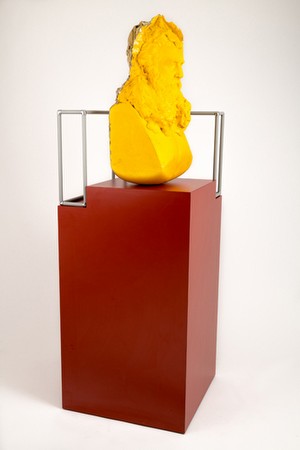 | Steven Claydon Total Social Objects April 27 – June 22, 2013 Opening reception: Saturday, April 27, 6:00–9:00pm David Kordansky Gallery is very pleased to announce Total Social Objects, an exhibition of new work by Steven Claydon. The exhibition opens on April 27 and runs through June 22, 2013; an opening reception will be held on Saturday, April 27 from 6:00 until 9:00 pm. Steven Claydon dramatizes and interrogates the ways in which objects have been described, venerated, understood and misunderstood throughout the course of civilization. This process involves a wide range of social, historical, economic, and literary factors, and is intended to differentiate an object's social or anthropocentric 'agency' from its innate, 'thingly' materiality. In Claydon's sculptures, objects are not seen as the antitheses of living things, but as entities that differ from the living by a difference of a degree, possessed of their own 'animism' and with their own capacity for will, hubris, and desire. Total Social Objects focuses on the migration of cultural forms, taking into account both physical movement and the transit of objects through hierarchies of ideas, values, and symbols. The exhibition consists of both floor- and wall-based works, and includes materials as diverse as steel, wood, aluminum, oil paint, straw, cuttlefish ink, and seaweed. Throughout, signifiers borrowed from maritime and shipping contexts have been passed through a visual sieve woven from numerous art historical tropes. Prime examples of this thrust in the work are two sculptures based on canister-like forms that have been rendered in highly finished materials. Claydon transforms the container––itself predicated on absence and what might fill it, like a floating signifier––into a modernist totem perched on self-consciously museological bases. The containers, as forms, are thereby displayed in a state of revolt against the utilitarian or servile roles into which they have traditionally been cast: they are allowed to shine as their own luxurious beings, even as they are elevated to the status of works of art and become cultural 'products' of another kind. Luxury is in fact one of the principal lines of signification that have been woven throughout the show. It can be seen in the color palette of reds, yellows, and neutral tones that unites the disparate materials on display, and keys associations, for instance, to high-end brands and the surfaces they fetishize. However, once displaced in the fictive, quasi-nautical realm that Claydon has created, these same colors simultaneously call to mind the seedier side of cultural transit, one that includes container ships and other purely utilitarian objects. The quality of luxury (especially as it pertains to artworks) becomes but one more burden that humans place upon the supposedly inert objects with which they surround themselves. The exhibition also suggests that high-end objects undergo their own version of tarnish and decay as they are transported from one realm (be it spatial, temporal, or cultural) to another. In Sc-scaffold (London prick), the intensely yellow bust of a bearded figure suggests a paradoxical form, both classical and contemporary in origin; when seen from behind, however, the yellow gives way to a craggy, metallic material reminiscent of sunken treasure, with the word 'London' stamped into its surface in the style of a hallmark. The passage of time is revealed precisely in terms of its material effect, and––as in other works on view that include labels and 'brands' of various sorts, including strange, rune-like symbols more in keeping with science fiction and space travel than sea transport––language points both to identification (familiarity) and loss (missing referents). In a series of wall-based works that straddle the lines between painting, sculpture, assemblage, and reliquary, the network of associations Claydon puts into play can be read as a kind of rebus. Perspex boxes contain various objects, including small, cartoonish, oil-on-linen images of sea creatures performing human activities; ceramic forms that appear to be Chinese dragons; and lengths of straw or video tape. They pose questions about why specific objects end up together, and about what produces the combinations of anthropocentrism and materiality that define them. This is particularly true of Picture Element (aquatic apes YAC), in which a haunting, realistically-rendered painting of a boating scene hovers behind a veil of tinted cellophane, surrounded by a convex laminate frame. The work is part vision, part artifact, a shard of fictional history dreaming its way into reality. Steven Claydon has been the subject of numerous solo exhibitions in institutional contexts, including Culpable Earth, firstsite, Colchester, Essex, England; Mon Plaisir... Votre Travail..., La Salle de bains, Lyon, France; The Ancient Set and The Fictional Pixel, Serpentine Pavilion, London; and Courtesy of the Neighborhood Watch, White Columns, New York. Notable group exhibitions include In the Space of the Beholder | Contemporary Sculpture, from the Sammlung Moderne Kunst, Pinakothek der Moderne, Munich; Soundworks, Institute of Contemporary Arts, London; Secret Societies. To Know, To Dare, To Will, To Keep Silence, Schirn Kunsthalle Frankfurt, Frankfurt, Germany and CAPC de Bordeaux; Time Again, SculptureCenter, New York; British Art Show 7: In the Days of the Comet; At Home/Not at Home: Works from the Collection of Martin and Rebecca Eisenberg, Center for Curatorial Studies, Bard College, Annandale-on-Hudson, NY; Golden Times, Haus der Kunst, Munich; Sympathy for the Devil: Art and Rock and Roll Since 1967, Museum of Contemporary Art, Chicago; and Rings of Saturn, Tate Modern, London. In addition, his work will be included in the upcoming Busted exhibition of outdoor sculpture on the High Line in New York. Claydon lives and works in London. | ||||