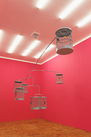 CARSTEN H�LLER, Gesangskanarienmobile (Singing Canaries Mobile), 2009 Powdercoated steel construction, wood, PVC Installation: approx. 500 x 300 x 250 cm, 7 bird cages: 45 x 45 x 60 cm (L x W x H) | |||