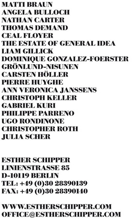 | Current at Esther Schipper 01 - 10 November 26, 2010 - January 22, 2011 Matti Braun, Angela Bulloch, Nathan Carter, Thomas Demand, Ceal Floyer, General Idea, Liam Gillick, Dominique Gonzalez-Foerster, Gr�nlund-Nisunen, Carsten H�ller, Pierre Huyghe, Ann Veronica Janssens, Christoph Keller, Gabriel Kuri, Philippe Parreno, Ugo Rondinone, Julia Scher, 80*81 The gallery will be closed from December 23, 2010 - January 08, 2011. As of February 01, 2011 you will find us at our new premises at Sch�neberger Ufer 65, 10785, Berlin. Selected Shows Esther Schipper at Galleria Continua/Le Moulin SPHERES 2010 October 23, 2010 - May 1, 2011 Esther Schipper presents works by Nathan Carter and Ceal Floyer www.galleriacontinua.com Carsten H�ller Rentier im Z�llnerstreifenwald October 29, 2010 - January 08, 2011 Schering Stiftung, Berlin www.scheringstiftung.de Carsten H�ller SOMA November 05, 2010 - February 06, 2011 Hamburger Bahnhof, Berlin www.somainberlin.org At Hamburger Bahnhof Carsten H�ller searches for the myth of Soma - a salutary potion to give you immortality and lead you to divine spheres. Soma is the first major solo show of Carsten H�ller in Germany. Philippe Parreno November 25, 2010 - January 23, 2011 Serpentine Gallery, London www.serpentinegallery.org The Serpentine Gallery presents the first exhibition of Philippe Parreno in a public gallery in the UK. Parreno has conceived the exhibition as a scripted space in which a selection of his recent films are presented, including his new film The Invisible Boy, 2010. Upcoming Art | Basel | Miami Beach 2010 December 2-5, 2010 Booth E03, Convention Center www.artbaselmiamibeach.com Matti Braun SALO December 11, 2010 - February 12, 2011 La Galerie, Noisy-le-Sec www.noisylesec.fr The exhibition shows the variety of works by Matti Braun, ranging from spatial installation, photography, batik and video. SALO is part of the German-French exchange program "Thermostat" and has also been shown at Kunstverein Braunschweig. For further information or subscribing to our newsletter please contact the gallery: [email protected] | ||||