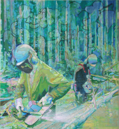 | Das Denken von Katrin Hoffert kreist zur Zeit um die Themengruppe: Wissenschaft und Wahnsinn, Fortschrittsglaube, unsinnige, absurde, fatale Erfindungen, bio- und soziologische Vorg�nge, Forscher und warum man sie auf Bildern fast immer zu zweit sieht (der Wissenschaftler und sein Assistent), genetische Patente, Sch�pfung, Krankheit, Tod, Energie. Sie sammelt dazu Fotos und Abbildungen, aus verschiedenen, privaten und �ffentlichen Quellen, und w�hlt die aus, die ihr komisch oder absurd erscheinen. Die Fotovorlagen werden zun�chst digital bespielt und damit ge�ffnet, das hei�t, durch Vereinfachungen und Verfremdungen (z.B. Zerlegung in Farbfl�chen, Eliminierung von unwichtiger Details, etc) von der Abbildhaftigkeit wegger�ckt und zugunsten der endlosen Matrix malerischer M�glichkeiten offen gemacht. Dabei kann sich der Einstieg zu einem malerischen Prozedere entwickeln, wobei es nat�rlich weder darum geht, das Foto zu imitieren, noch darum irgendwelche Photoshopfilter nachzuahmen. Hoffert ist von der Neugier auf das Werden des Bildes getrieben, befindet sich in einer forschenden Rolle, die jedes Bild als neue Versuchsanordnung begreift, mit deren Bauteilen es zu experimentieren gilt. �ber einen langwierigen Dialog mit dem Material findet gewisserma�en eine alchemistische Transformation von fotografischer zu malerischer Materie statt, die im Sinne einer Entschleunigung und Verdichtung der medialen Vorlagen in eigenst�ndigen und -im Wortsinn- merkw�rdigen Bildern m�ndet. | ||||