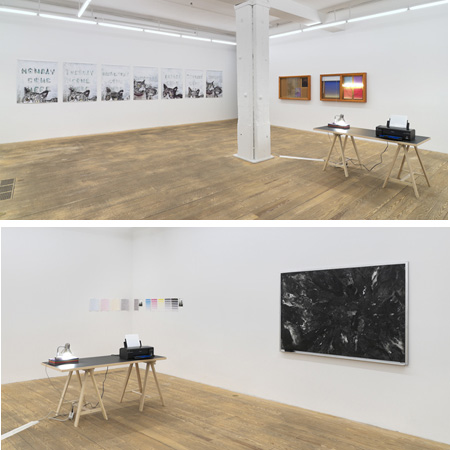 | DEVILLE COHEN ANDREI KOSCHMIEDER JOE WINTER Exhibition: January 6-29, 2011 Reception for the artists: Thursday, January 20, 6-8 pm Gallery hours: Tuesday - Saturday, 11-6 pm Foxy Production presents work by three artists who foreground process in their inventive and unexpected transformations of images and materials. Deville Cohen, Andrei Koschmieder, and Joe Winter interweave production, performance and presentation in their reprogramming of everyday systems and procedures. Deville Cohen's performance-based photographs and video installations use black-and white Xerox images as integral elements in their mise-en-scene. Sets, characters, and props become entangled in psychic dramas saturated with humor, desire, and anxiety. Cohen's video, The Wall, combines both �real� and Xeroxed objects, some of which � bricks, a Xerox machine � cover the performers faces. The central scene � a Xeroxed brick wall � is eventually punctured by a character in red heels, who simultaneously punctures any space between scenes and the objects and people in them. Cohen's two-dimensional works inspire the making of his videos: here he presents a series of drawings on collaged, Xeroxed paper, reminiscent of expanded, intriguingly dramatic and detailed film storyboards, that attempts but never quite succeeds in producing a cohesive narrative. Andrei Koschmieder makes painterly works that bring the studio into the street in witty, nuanced combinations of chance and choice. Koschmieder presents a series of images made using a low-tech contact print method that deliberately prolongs their production time. A local calligrapher was employed to add a sequence of texts to each image, giving them handcrafted yet repetitive marks. The set of works� fusing of contrasting elements produces a dynamic quality where everything seems to collapse and come together at once. Joe Winter�s images evolve and dissolve, often through the combustion of ink and light, and the force of error and malfunction. Winter has created an active, office-like area that includes a lamp focused on colored construction paper and a printer with print-outs of ethereal, deteriorating sunsets, emerging as the machine�s ink runs out. Faded paper from under the lamp and abstract prints resulting from the violent shaking of the printer are hung on the walls. Nearby a dry erase board is smeared with marker ink; with the marker pen left there, poised for use, the destablizing of everyday processes seems to be an end in itself. Deville Cohen (Tel Aviv, 1977) lives and works in Brooklyn, NY. He studied at the Weiseensee Kunsthochschule Berlin and holds an MFA from Bard Collage, Annandale-on-Hudson, NY. Exhibitions include: Braverman Gallery, Tel Aviv (solo); Recess, New York (solo); Greater New York, MoMA PS1, Queens; The Company, Los Angeles; Lesley Heller Workspace, New York (all 2010); Nowhere Gallery, Milan (solo); LAXART, Los Angeles (screening)(both 2009); tor111, Berlin (solo)(2008); and Living Art Museum, Reykjavik, Iceland (2006). Andrei Koschmieder (Frankfurt, Germany, 1980) lives and works in Brooklyn, NY. He holds an MFA from the Staatliche Hochschule f�r Bildende K�nste, Frankfurt. Exhibitions include: White Columns, New York; Johan Berggren Gallery, Malm�, Sweden (solo); Credenza, New York (solo); Cleopatra�s, New York; 179 Canal, New York (all 2010); RGB LED, Seoul, South Korea; Johan Berggren Gallery, Malm�, Sweden; Pro Choice, Vienna, Austria; Neue Alte Br�cke, Frankfurt (2009); Kunstverein St. Pauli, Hamburg, Germany; Literaturhaus, Frankfurt; and Hold & Freight, London (both 2008). Joe Winter (Wilmington, DE, 1981) lives and works in Brooklyn, NY. He holds a BA in New Media Studies from Brown University, Providence, RI; and an MFA from UC San Diego. Exhibitions include: The Kitchen, New York (solo)(upcoming 2011); CCS Bard College, Annandale-on-Hudson, NY (project)(2010); Plug.In., Basel, Switzerland; Marian Spore, Brooklyn, NY; X Initiative, New York; Space 414, Brooklyn; Urbis Center, Manchester, UK (all 2009); Eyebeam, New York (2008); Los Angeles Municipal Art Gallery; University Art Gallery, UC San Diego; Compact Space, Los Angeles (all 2006); Museum of Contemporary Art, San Diego; Compact Space, Los Angeles (both 2005); and Estacion Tijuana, Mexico (2004). Special thanks to Johan Berggren Gallery and Michael Connor. For high resolution jpgs or further information please reply to this email or call +1 212 239 2758. FOXY PRODUCTION 623 W 27 ST NYC 10001 USA +1 212 239 2758 --- FP NEWS http://www.foxyproduction.com/news/ | ||||