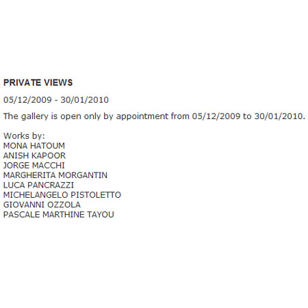 | PRIVATE VIEWS 05/12/2009 - 30/01/2010 The gallery is open only by appointment from 05/12/2009 to 30/01/2010. Works by: MONA HATOUM ANISH KAPOOR JORGE MACCHI MARGHERITA MORGANTIN LUCA PANCRAZZI MICHELANGELO PISTOLETTO GIOVANNI OZZOLA PASCALE MARTHINE TAYOU | ||||