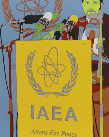 | Georg Kargl Fine Arts Lisa Ruyter Atoms For Peace 14/11/2008-11/01/2009 Georg Kargl Box Nicole Wermers Public Rain Fries 14/11/2008-11/01/2009 LISA RUYTER Atoms for Peace Georg Kargl Fine Arts Exhibition dates: November 14, 2008 � January 11, 2009 ARTIST TO PRODUCE PAINTINGS BASED ON COVERAGE OF IAEA BOARD OF GOVERNORS MEETINGS IN VIENNA Artist Lisa Ruyter has been covering International Atomic Energy Agency (IAEA) Board of Governors meetings as an invited journalist. Her reporting will take the form of a series of new paintings based on photographs made at official events of the IAEA. The completed works will be shown this November in a solo exhibition at her representative gallery in Vienna, Georg Kargl Fine Arts. This is not the first time Ruyter has blurred the lines between artist and reporter. In 2004 at the request of [Andy Warhol`s] Interview Magazine then Editor-In-Chief Ingrid Sischy, Ruyter covered the Paris Couture Shows for the magazine and the resultant paintings appeared in Dec/Jan 2005 issue and were the focus of a highly acclaimed 2005 solo show in Berlin. Since 1996, Lisa Ruyter's paintings have been based on individual photographs taken by the artist and have formed a map of her movements around the globe as well as her personal development. Ruyter selects a small percentage of these pictures and begins the process of fixing them in the medium of painting. She "transcribes" the photographs onto the picture plane, selects the areas of the image that she wishes to render, leaving out details she thinks trivial, while focusing on others. Once the drawing is in place, Ruyter begins to map out colors within the structure of that drawing. The final fixing of the images occurs when Ruyter, usually in a single sitting, redraws the lines with a paint pen, bringing the image into sharp focus. The power of Ruyters paintings is in the way she takes on seemingly ordinary images and makes them extraordinary. What at first appear simple but giant paint-by-number works slowly reveal themselves to be complex arrangements of flat colors with poignant, powerful subject matter. The effect freezes the narrative and pushes it toward abstraction, and highlights potential subtexts. In these new works, Lisa Ruyter questions again the relationship of subject matter and visual effect. An IAEA meeting perhaps looks like an ordinary occasion, but these particular meetings are charged with the undercurrent of one of the largest news stories of this moment in time. She approaches the �nuclear� story with the same eye and process that she did with Haute Couture. The results of this exploration are images that seem directly lifted from the pages of a popular graphic novel. For what I want to do, so expresses Lisa Ruyter, it is important to avoid encouraging a singular hegemonic reading at all costs. By that I mean that one thing has to be dominating the reading, rather than allowing all of the elements to carry information. It is certainly possible to make such a determined reading, but there is enough on the surface of the paintings and in the subject matter to always add an alternative to the reading. About Lisa Ruyter Lisa Ruyter, an American, 40, lives and works in Vienna. The artist has shown her work in galleries and museums the world over including, among others, the Museum of Modern Art (New York), the San Francisco Museum of Modern Art (USA), the Elgiz Museum of Contemporary Art (Istanbul), the Denver Art Museum (USA), Collection le Consortium (Dijon, France), La Colecci�n Jumex (M�xico), the Essl Collection (Klosterneuburg/Vienna), and Valencia Arte Contempor�neo (Spain). Lisa Ruyter has had more than twenty-five solo exhibitions in leading galleries around the world. She is represented exclusively by Georg Kargl Fine Arts (Vienna), Galerie Thaddaeus Ropac (Salzburg/Paris), Taka Ishii Gallery (Tokyo), and The Breeder (Athens). Atoms for Peace is her third solo show at Georg Kargl Fine Arts after 2001 and 2003. About the IAEA Headquartered at the Vienna International Centre in Vienna, Austria, The International Atomic Energy Agency (IAEA) is the world`s foremost forum for scientific and technical cooperation in the peaceful use of nuclear technology. Established in 1957 as an independent organization under the United Nations, the IAEA represents the realization of US President Dwight D. Eisenhower`s visionary �Atoms for Peace� speech to the UN General Assembly in 1953, wherein he proposed the creation of an international body to both control and promote the use of atomic energy. Today, the IAEA`s broad spectrum of services and activities is based on the needs of its 144 Member States. IAEA programs and budgets are set through decisions of ist 35-member Board of Governors and the General Conference of all Member States. The Board of Governors generally meets five times per year. It examines and makes recommendations to the General Conference on the IAEA`s accounts, programs and budget and considers applications for membership. It also approves safeguards agreements and the publication of the IAEA`s safety standards, and has responsibility for appointing the Director General with the approval of the General Conference. In case of a country`s non-compliance with its safeguards commitments, the Board decides upon further steps, ranging from a call for clarification to a possible referral to the United Nations Security Council. Recent meetings of the Board have focused on the Iranian nuclear issue and attempts to determine the full nature of Iran`s nuclear program. Text by: Timothy Hartley Smith www.georgkargl.com press contact: [email protected] | ||||