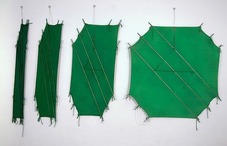 | Richard Smith Kite Paintings 22 November 2012 – 12 January 2013 No Evening Private View as previously announced In 1972, Richard Smith exhibited his first 'kite’ paintings at Kasmin Gallery. More kite paintings followed at his show in 1975 at O.K. Harris Gallery in New York. In the same year, Smith was offered a retrospective at the Tate Gallery and he made use of the central Duveen Gallery to display a series of large-scale kite works, both affixed to the wall and suspended from the ceiling, their ropes trailing to the ground. Richard Smith has always been interested in paintings which work in three dimensions, often making use of both floor and wall. Canvases stretched over wooden frames, then painted, appeared in 1963. Gradually his wooden frames diminished in size and the canvases became more wall mounted affairs. Eventually, Smith replaced the heavy wood with thin aluminium poles on which the painted canvas was stretched in shapes ranging from a narrow, vertical rectangle to square. A single work might consist in three or more canvases either overlapping or hanging in sequence. Richard Smith was by then living in the English countryside, having returned from New York, and his colours underwent a shift towards the pastoral and muted. The sequencing of canvases in a singular work, with a single colour rendered in different tones from canvas to canvas, reminds one of Monet's serial paintings, such as his Haystacks series, with a singular subject painted in different chromatic keys. Smith's approach to painting echoes that of the French Support-Surfaces group, who at the time were investigating the possibilities of unstretched canvas, manipulated into different shapes, using both wall and ground as spaces for two-dimensional artworks. The kite paintings are meticulously worked through. The contrast betwen hard poles and soft canvas is carried over to the use of string and rope, the soft means by which the hard stretch is obtained. As Barbara Rose wrote in the Tate Gallery's catalogue to Smith's exhibition, 'The conception of the stretcherless paintings, that are surface alone, has finally coalesced: separable elements are once more thoroughly synthesised in the new format... These consistent allusions to the human condition prove that abstract art is not necessarily divorced from man's experience'. Richard Smith was born in Herfordshire in 1931 and lives in New York state. For further information please contact [email protected] Tel: +44 (0)20 7493 2488 Gallery hours: Mon - Fri 10am - 5.30pm, Sat 11am - 4pm | ||||
