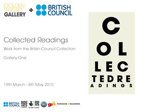 | Collected Readings Works from the British Council Collection Gallery 1 Bad Faith Common Culture Gallery 2 19th March - 8 May 2010 We would be delighted if you would join us between 6pm and 8pm on Friday 19th March to celebrate the launch of two new exceptional contemporary visual art exhibitions, Bad Faith and Collected Readings at the Golden Thread Gallery. Collected Readings is an exhibition of works selected from the British Council Collection that sets out to explore aspects of word in display. The exhibition consists of works featuring text as an integral element of the image by eleven celebrated artists: Fiona Banner, Ian Breakwell, Victor Burgin, Jimmie Durham, Tracey Emin, Hamish Fulton, Richard Hamilton, Matthew Higgs, Richard Long, Donald Urquhart; spanning five decades. The exhibition, realised in collaboration with the British Council Northern Ireland, will be supported by a contextual program that includes a Key Note lecture by Victor Burgin on Wednesday 24th March at 12.00 noon and Dr. Christa-Mia Lerm Hayes�s lecture Collective Reading - Relationships Between Contemporary Artists' Works and Literature on Tuesday 27th April at 12.30pm. Bad Faith is an exhibition by the collaborative artist�s group Common Culture. The Bad Faith exhibition will feature the first showing of Common Culture�s new work I Dreamt I Was A Monkey � And They Made Me Wear Shoes, a multi�channel video installation featuring �ex�TV �soap� actors performing scenes of discrete social interaction� set against a backdrop of high street consumption. Common Culture, founded in 1996, has exhibited to much critical acclaim internationally and is well known for works that �take the stuff of real popular culture (not fashionably sanitised pop) and represent it as exercises in intellectual and aesthetic provocation and dislocation.� Robert Clarke, the Guardian. 25.11.06 We hope that you will be able to join with us to celebrate the launch of both of these truly remarkable exhibitions at Northern Ireland�s leading international contemporary art gallery. Project Space: Scope 1 - 18 April, 2010 Opening on Thursday 1st April from 6-9pm, as a feature of Belfast's Late Night and running until the 18th April 2010 Scope in the Project Space provides and opportunity for a local audience to experience examples of the work exhibited at the Scope Art Fair, New York in March by Lisa Byrne, Victoria J Dean, Allan Hughes and Keith Winter. ABOUT THE GALLERY The Golden Thread Gallery is Northern Ireland�s leading international contemporary art space, rooted in the local. The gallery offers residents and visitors to Belfast a diverse programme of high quality contemporary art exhibitions and participatory events. As one of Northern Irelands largest visual arts venues the Golden Thread Gallery acts as a platform for a mix of the very best international and local artists, hosting six large-scale exhibitions in the main gallery spaces and twelve exhibitions in its project space. The project space openings are not to be missed and always take place at 6.00pm on the first Thursday of the month as part of Belfast�s Late Night Art. Outreach is at the core of the gallery�s activities, working off-site and in partnership with a wide range of communities and groups, devising challenging and innovative projects in addition to providing a range of contextual activities such as artists� talks, gallery tours and workshops. The gallery also publishes exhibition catalogues and books exploring further contemporary practices. Over the last ten years the Golden Thread Gallery has established an excellent reputation for creating exhibitions exploring art from the North Ireland, delivering exhibitions to international audiences through its touring programme. The gallery has delivered numerous curated exhibitions to venues across the UK and Ireland, Europe, North America, China and more recently Taiwan. In recent years the Golden Thread Gallery has been working with a number of artists living and working in Northern Ireland to create a �not-for-profit� form of artists� representation and has championed their work at national and international art fairs, such as the London Art Fair, Berliner Liste and Scope New York as well as establishing a dedicated in-house sales room. For further information visit our website � www.goldenthreadgallery.co.uk , join us on Facebook or call us on ++44(0) 2890 330920 The Golden Thread Gallery is a registered charity and admission is free. Gallery tours available. Open Tuesday � Friday 10.30am � 5.30 pm Saturday - 10.30am � 4pm Gallery Director: Peter Richards 84-94 Great Patrick Street, Belfast, BT1 2LU T:(028) 9033 0920 W: www.goldenthreadgallery.co.uk E: [email protected] | ||||