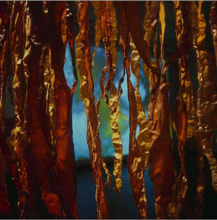 For this installation, Rootless Algas, large multi-colored algae have been made by casting translucent abaca sheets into molds that are then hung from ceiling to floor. The work intends to express certain feelings of isolation and attempts to convey characteristics of the actual experience, rather than explorations or descriptions. I have removed the plants from their original context and reinvented them to highlight the dynamic between nature and human beings. The configurations of the area require people to experience their surroundings from multiple viewpoints. That spatial virtuality is augmented with a video projection and soundtrack by Icelandic composer Hilmar �rn Hilmarsson. In addition, viewers will have to find and create their own space and in doing so they will recreate on a small scale the limitless scope of the natural world.