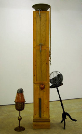 | Carl Plackman Alternative Universe Private view: Thursday 19 May, 6-9pm 20 May - 25 June, 2011 Hales Gallery is pleased to present a selection of works from the estate of the influential British sculptor Carl Plackman who died in 2004. The gallery began working with the Plackman Estate in 2010 and this is the first solo exhibition of his assemblage sculptures at Hales Gallery. Alternative Universe refers to Plackman's rearranged, complex and enigmatic value system which, through his use of carefully crafted objects applied to all of the works he made. Plackman was a sculptor exploring the invisible threads of imaginative human connections that can ignite the space around things. The works explore the realm of the symbolic. The viewers are encouraged to place significance on objects that singularly hold little importance. It is in this sense that Plackman's work acts as a puzzle where narratives and form are discovered. It is impossible to pin down a singular reading on any work as ambiguity is precisely what was intended. Clarity is blurred as the pieces operate simultaneously on a subconscious, metaphysical and material level. The show features a number of works from the 80's, 90's and 00's. Several, such as Decoy (2000) and All the Great Minds (1999) are floor based works made with multiple elements, whilst others, such as Obliterated Confessions (1986) and Rise and Fall (2003), combine large framed drawings with carefully selected sculptural elements. These ready-mades and found objects play crucial roles in exploring what we expect from sculpture. From the outset it was clear that Plackman's ideas and work stood apart from other sculptors in the field. An influential figure to numerous generations of artists who having passed through London's Goldsmiths College of Art (1970-99) and the Royal College of Art (1974-80), where he taught, benefited from his singular and thoughtful view, some of whom were influenced by his liberating approach and went on to have important and successful careers themselves. The language that Plackman developed (that of object, symbol, materiality and metaphor) looks completely at home with a new generation of artists showing and working in Britain today. Throughout the 1970's and into the early 1980's, sculpture in Britain was viewed as a very separate entity to that of previous sculptors and had a plethora of exhibitions dedicated to it. Plackman was at the forefront of many of these shows including New Sculpture (1970) an Arts Council touring exhibition, Three Sculptors (1972) and Scale for Sculpture (1978) at London's Serpentine Gallery, British Sculpture (1972) at The Royal Academy of Arts and British Sculpture 1950-1980 Part 2: Symbol and Imagination, shown at the Whitechapel Gallery. However, one senses that Carl was never completely happy having his work placed alongside the hermetically sealed world of 'The Sculptor' as his work, at the time, consistently pushed at the boundaries of an acceptable language. Carl Plackman left an impressive body of work spanning five decades including diverse drawings, expansive sculpture and many preparatory sketches. His legacy refuses to diminish and his work has now become particularly relevant to the development of British sculpture and successive generations of British artists. In 2007, the book accompanying his retrospective show Beyond Appearances was published by Huddersfield City Art Gallery featuring commentary from numerous important contributors. Plackman's work is included in the collections of Tate, Henry Moore Institute, Arts Council Collection, British Museum, Victoria and Albert Museum, The Courtauld Institute and the National Museum of Wales. For further information please contact Hales Gallery at [email protected] or call 44 (0)20 7033 1938. | ||||